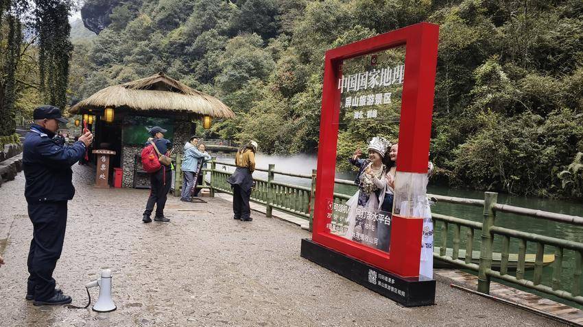 图为景区保安为游客拍照